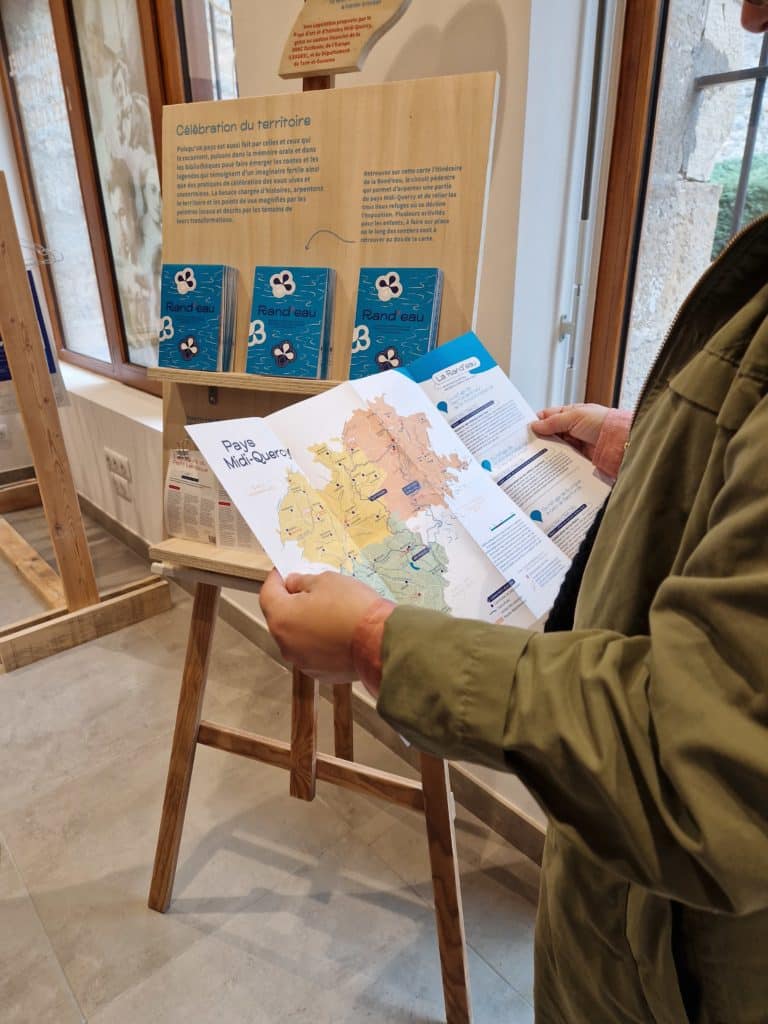 - Un totem comportant le nom de l’exposition et de la thématique, ainsi qu’un kit Rand’Eau en libre distribution. Le kit se compose d’une carte du pays Midi-Quercy, d’un descriptif des 3 thématiques, de jeux et de 5 fiches randonnées sur l’eau.