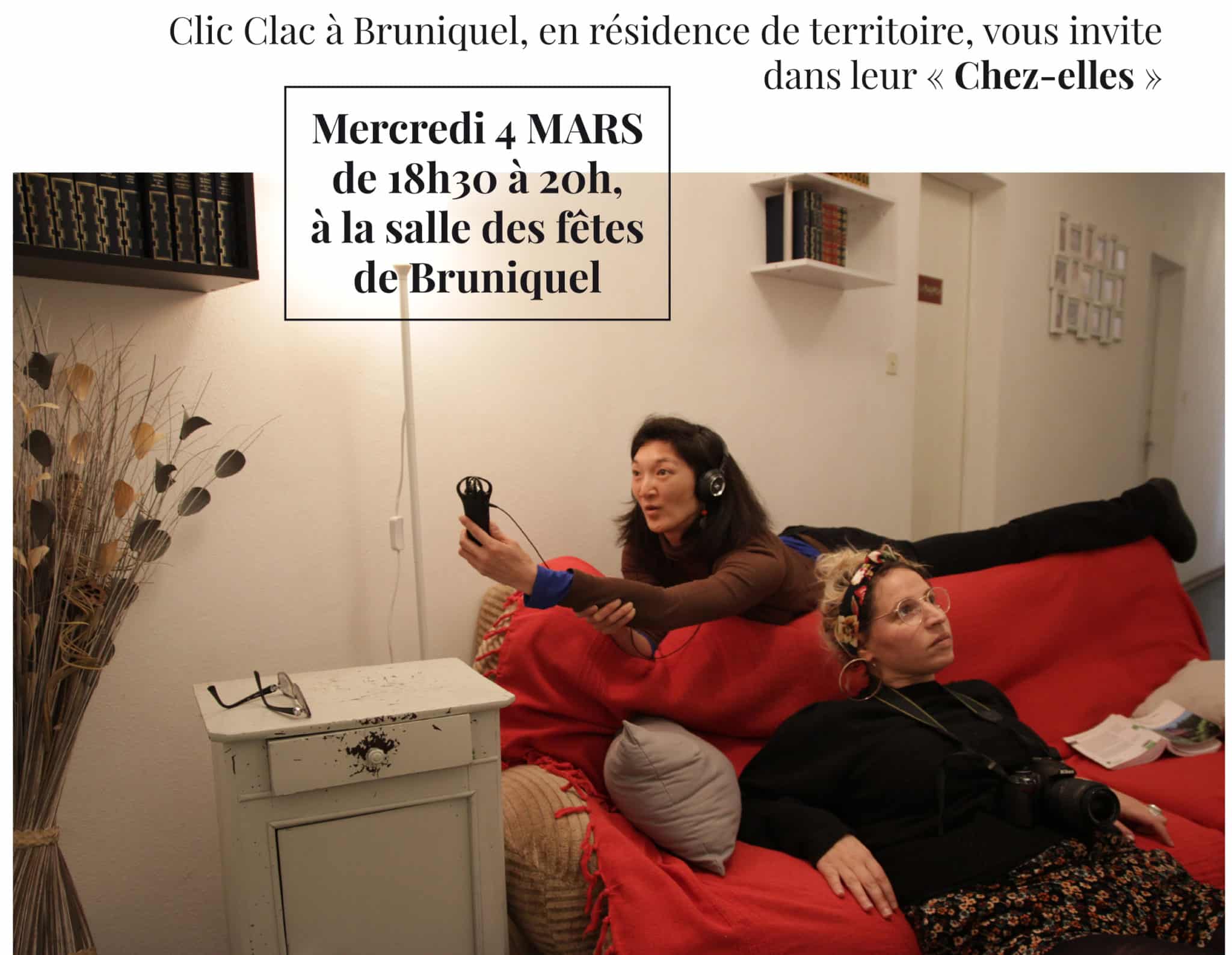 Les deux artistes Léa Hernandez et Sarah Bourhis, en résidence avec l’association culturelle LE FOND ET LA FORME, ont posé leurs valises à la salle des fêtes de Bruniquel. Elles vous y invitent le Mercredi 4 Mars à 18h30 pour leur premier événement public nommé « Chez elles ».
